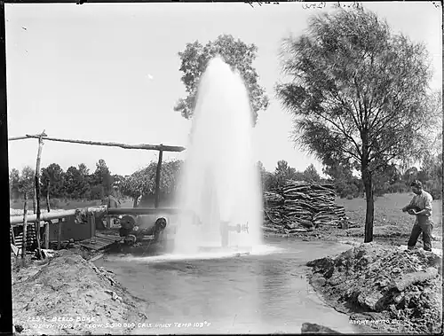 Prior to the arrival of Europeans, waters of the Great Artesian Basin (GAB) discharged through mound springs, many in arid South Australia, such as Witjira-Dalhousie Springs. These springs sustained a variety of endemic invertebrates, such as molluscs, and supported extensive Aboriginal communities and trade routes.[8] After the arrival of Europeans, the springs facilitated exploration, and allowed the provision of faster communications between south-eastern Australia and Europe, via the Australian Overland Telegraph Line.[8] The Great Artesian Basin became an important water supply for cattle stations, irrigation, and livestock and domestic purposes, and is a vital life line for rural Australia.[9] To tap it, boreholes are drilled down to a suitable rock layer, and the pressure of the water often forces it up without the need for pumps.