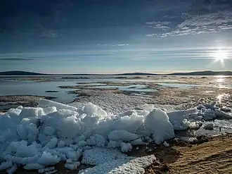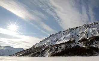 Central Yakutian Lowland, the alluvial plain of the middle Lena River separating the Central Siberian Plateau to the west and the East Siberian Mountains to the east. Area 300,000 km2 (120,000 sq mi).[3]