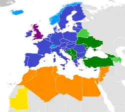 Members of the European Union Members of the European Free Trade Association Microstates with which the EU has Special Agreements Countries which are part of the EU's current Enlargement Agenda Members of the EU Eastern Partnership Countries which are both members of the UfM and are part of the European Neighbourhood Policy Country which is only part of the Union for the Mediterranean EU–UK Trade and Cooperation Agreement |