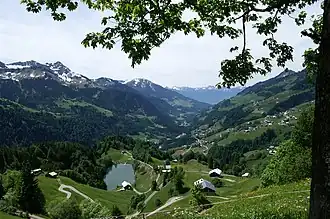 View south-westward from the foot of Blasenka over the Seewaldsee, the only lake of the valley, strangely on the ridge, and the lower Großwalsertal | |