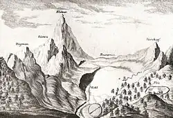 The name Glocknerer is first documented in a 1561 map designed by the Viennese cartographer Wolfgang Lazius. The denotation Glogger is mentioned in a 1583 description of the Tyrolean Kals legal district, then referring to the whole ridge south of the Alpine main chain. In the 1760s, the Atlas Tyrolensis listed a Glockner Berg, the prefix Gross- ("great") is not mentioned before the first expedition in 1799.