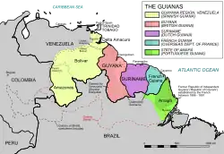 1. ^ The term Guiana or The Guianas is often used as a collective name for Guyana, Suriname and French Guiana, and sometimes even includes the portions of Colombia, Venezuela and Brazil (including most of the state of Roraima) which are on the Guiana Shield.