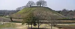 - Saitama Kofun Park (さきたま古墳公園) is a 300,000 square metres (3,229,173 sq ft) historic park dotted with large ancient tombs, including the Maruhakayama Kofun, one of the largest round burial mounds in Japan. At Shogunyama Kofun, a key-hole shaped 91 metres (299 ft) long burial mound that is square at the head and rounded at the foot, there is a display room of its interior where the stone cave hut and excavated articles have been restored to their original conditions in the 5th to 7th centuries.[7]