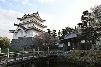 - Oshi Castle (忍城御三階櫓, Oshi-jo Gosankai Yagura) is a 1988 reconstruction of the third yagura tower of Oshi Castle. The daimyō Narita Akiyasu built Oshi Castle near the end of the 15th century using the natural levee of the surrounding marshlands and river. It was considered impregnable. When it was attacked by the 20,000 man army of Ishida Mitsunari in 1590, it did not fall even when it was flooded by water drawn in from the nearby river, leading to the rumor that it floated on water. The existing turret was reconstructed in 1988.[6] The castle grounds are also the home of Oshi Tōshō-gū shrine.
