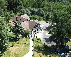 In 1884 The German Alpine Club branch at Asch (now Aš) built an Alpine Club house for hikers, the Hainberghaus. The building was seized in 1945 and renamed the Horská chata Háj. The interior was burned out in 2009 and the building has fallen into decay.[5]