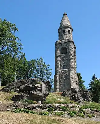 A 34-metre-high (112 ft) stone observation tower on the summit was built in 1902–1904. It was designed by the Dresden architect Wilhelm Kreis. The tower bore name of Otto von Bismarck until 1946, when it was renamed Háj u Aše.[2] The tower still stands and is one of the three Bismarck towers on the territory of the Czech Republic.[4]
