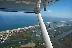 Aerial view of the south part of Halifax River, at Ponce Inlet - Daytona Beach Shores, Florida - This relatively new, small community is located entirely on the beach peninsula, south of Daytona Beach. The community was formed in 1960 by a group of moteliers who called themselves 2,000 Cottages. The City incorporated in 1967 as Daytona Beach Shores, becoming another namesake of Mathias Day. Commonly called "The Shores" by local residents to avoid confusion.