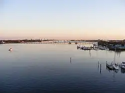 A view of the Halifax River southbound from the Seabreeze Bridge, Daytona Beach, Volusia County, Florida. Three other bridges can be seen from this vista: Main Street Bridge (closest), Broadway Bridge, and Veterans Memorial Bridge. Two boat marinas can be seen to the right. | |
