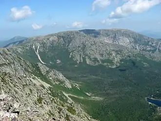 Hamlin Peak is a 4,756-foot (1,450 m) mountain located in Baxter State Park in Piscataquis County, Maine.[3] Hamlin Peak is a northern spur of the greater Mount Katahdin massif and is flanked to the south by Baxter Peak, and to the north by the Howe Peaks. Since it rises nearly 500 feet (150 m) above the col joining it to the higher Baxter Peak, Hamlin Peak qualifies as a four-thousand footer based on the topographic prominence criterion used by the Appalachian Mountain Club, and is ranked as the second-highest peak in Maine.
