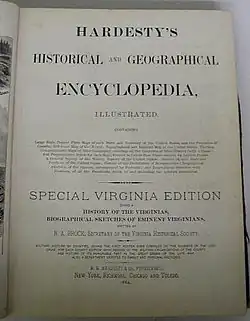 Hardesty's Historical and Geographical Encyclopedia was a voluminous late 19th century American encyclopedia produced by H.H. Hardesty & Company, publishers, of Chicago and Toledo.[1] A massive work with enormous amount of textual and statistical data, it went through various editions and variations throughout the 1880s, with some special editions focusing on areas of special regional significance. (E.g., a stand-alone military history under the title The Military History of Ohio in special county editions which did not include the more general information in the main Encyclopedia, but included the state's general military history in addition to a specific county's military history. Another example was the Special Virginia Edition giving a history of the Virginias, written by R.A. Brock, secretary of the Virginia Historical Society.)