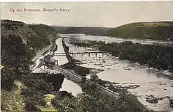 As early as 1878, the Baltimore and Ohio Railroad ran excursion trains to Harpers Ferry from Baltimore and Washington.[49][50] As described in a newspaper in 1873: "One need only to alight from the train and look a little envious toward the old Engine House or the ruined walls of the old Arsenal in order to have a score of persons offering to become a kind of guide or to point out to your whatever you may desire to know about the great struggle which ended in the 'opening of the prison doors, the breaking of every yoke, the undoing of heavy burdens, and letting the oppressed go free."[51]