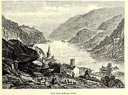 On October 25, 1783, Thomas Jefferson visited Harpers Ferry as he was traveling to Philadelphia. Viewing "the passage of the Potomac through the Blue Ridge" from a rock that is now named for him as Jefferson's Rock, he called the site "perhaps one of the most stupendous scenes in nature"[20]: 22 and stated, "This scene is worth a voyage across the Atlantic."[21] The town was one of his favorite retreats, and tradition holds that much of his Notes on the State of Virginia was written there.[22] Jefferson County, in which Harpers Ferry is located, was named for him on its creation in 1801.[23]
