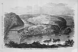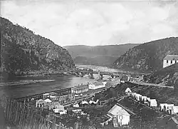 ![]() Aerial view of Harpers Ferry from Maryland Heights at the confluence of the Shenandoah (left) and Potomac Rivers | |
