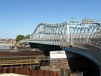 A road to the Hudson Waterfront was completed in 1750, named for Douwe's Ferry which it met at its eastern end to cross the Hackensack River.[26] In 1790 the state legislature decided that "public good would be served by a 64-foot road from Paulus Hook to Newark Courthouse". By 1795, a bridge over the Hackensack 950 feet (290 m) long and another over the Passaic 492 feet (150 m) long (at the site of the Bridge Street Bridge) were built creating an uninterrupted toll road connection.[27] It is now known as the Newark-Jersey City Turnpike.