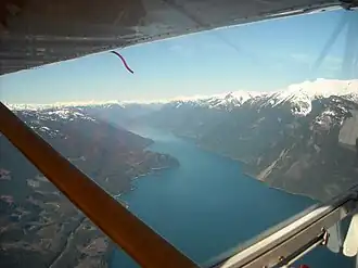 Harrison Lake is the largest lake in the southern Coast Mountains of Canada, being about 250 square kilometres (95 mi2) in area.[2] It is about 60 km (37 mi) in length and at its widest almost 9 km (5.6 mi) across. Its southern end, at the resort community of Harrison Hot Springs, is c. 95 km east of downtown Vancouver. East of the lake are the Lillooet Ranges while to the west are the Douglas Ranges. The lake is the last of a series of large north–south glacial valleys tributary to the Fraser along its north bank east of Vancouver, British Columbia. The others to the west are the Chehalis, Stave, Alouette, Pitt, and Coquitlam Rivers. Harrison Lake is a natural lake, not man-made. The lake is supplied primarily from the Lillooet River, which flows into the lake at the northernmost point.