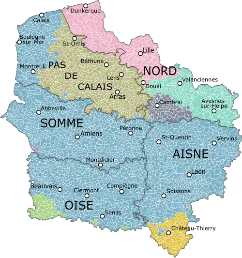 Hauts-de-France comprises five departments: Aisne, Nord, Oise, Pas-de-Calais, and Somme.