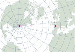 - ^ This calculation was made using the open-source geodesic calculation software GeographicLib, assuming the WGS84 ellipsoid. See Karney, Charles F. F. (2013). "Algorithms for geodesics". Journal of Geodesy. 87 (1): 43–55. arXiv:1109.4448. doi:10.1007/s00190-012-0578-z.