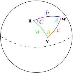 Given a unit sphere, a "triangle" on the surface of the sphere is defined by the great circles connecting three points u, v, and w on the sphere. If the lengths of these three sides are a (from u to v), b (from u to w), and c (from v to w), and the angle of the corner opposite c is C, then the law of haversines states:[10]