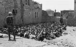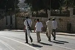 At this time following attempts by the Lithuanian government to draft yeshiva students into the army, the Lithuanian Hebron Yeshiva (Knesses Yisroel) relocated to Hebron, after consultations between Rabbi Nosson Tzvi Finkel, Yechezkel Sarna and Moshe Mordechai Epstein.[145][146] and by 1929 had attracted some 265 students from Europe and the United States.[147] The majority of the Jewish population lived on the outskirts of Hebron along the roads to Be'ersheba and Jerusalem, renting homes owned by Arabs, a number of which were built for the express purpose of housing Jewish tenants, with a few dozen within the city around the synagogs.[148] During the 1929 Hebron massacre, Arab rioters slaughtered some 64 to 67 Jewish men, women and children[149][150] and wounded 60, and Jewish homes and synagogs were ransacked; 435 Jews survived by virtue of the shelter and assistance offered them by their Arab neighbors, who hid them.[151] Some Hebron Arabs, including Ahmad Rashid al-Hirbawi, president of Hebron chamber of commerce, supported the return of Jews after the massacre.[152] Two years later, 35 families moved back into the ruins of the Jewish quarter, but on the eve of the Palestinian Arab revolt (April 23, 1936) the British Government decided to move the Jewish community out of Hebron as a precautionary measure to secure its safety. The sole exception was the 8th generation Hebronite Ya'akov ben Shalom Ezra, who processed dairy products in the city, blended in well with its social landscape and resided there under the protection of friends. In November 1947, in anticipation of the UN partition vote, the Ezra family closed its shop and left the city.[153] Yossi Ezra has since tried to regain his family's property through the Israeli courts.[154]