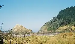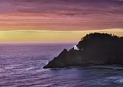 Heceta Head (/həˈsiːtə/ hə-SEE-tə) is a headland that stands 1,000 feet (300 m) above the Pacific Ocean in Lane County, Oregon, United States. The Heceta Head Light is located on its south side. Heceta Head is named after a Basque explorer under Spanish commission, Bruno de Heceta, who explored the Pacific Northwest in the 1770s.[1] The headland marks the end of a lower-lying stretch of the coastline to the south dominated by sand dunes; the coastline to the north is more varied.[2] Devils Elbow is the bay south of the headland at the mouth of Cape Creek, and with the headland formed Devils Elbow State Park, which is now part of Heceta Head Lighthouse State Scenic Viewpoint.[3][4]