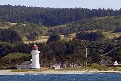 The hilly countryside with a long and accessible coastline in a mild, not to hot, summer climate is an attraction. Sletterhage Fyr, an old lighthouse in southwestern Helgenæs, and Tyskertårnet, a concrete watchtower built during the German occupation in World War II, are also visited by many guests. In the southwestern part of Helgenæs, in the town of Ørby, is a gallery with the paintings of Bo Bendixen, a noted Danish painter.[6]