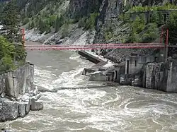 By the 1850s the Fraser Canyon was transformed from a First Nations and fur trade corridor to a busy route, called the Cariboo Road, used by gold rush miners seeking access to the upper Fraser Basin. During the 1880s, the Canadian Pacific Railway built a new transcontinental railroad to unite the far-flung provinces of the young Dominion of Canada.[5] This nation-building project saw new railroad tracks constructed on the west riverbank at Hells Gate, connecting the British Columbia coast to the Interior (and the rest of Canada) through the Fraser Canyon.[5] Some assert that rocks and debris dumped into the river during construction of the CPR constricted the river flow and impeded salmon passage, though there is no documented historical or physical evidence to support this claim.[6] By early 1911 the Canadian Northern Railway began a second transcontinental railway along the south and east bank of the canyon, which was completed in a year's time. While carving into canyon walls to create new rail-bed, rock and debris were again dumped into the river in significant volumes at various locations, including Hells Gate.[2] In early 1914, two years after the completion of the CNoR and during construction of a new tunnel, a large rockslide fell into the river just above the Hells Gate portal. Debris dispersed on the river bottom caused a 5-meter vertical drop in water depth and increased water velocity from five metres per second to 6.75 metres per second.[7] As observed and noted by local residents and later by biologists in the aftermath of the slide, noticeably higher water velocity seemed to exceed the swimming capacity of the salmon, resulting in premature mortality and reduced populations of salmon fry in the subsequent year.[6] In an initial attempt to redress the ecological and physical changes at Hells Gate that impeded migrating salmon, tons of rocks and debris were removed from the river during the winter of 1914-1915. By early 1915, Hells Gate was pronounced clear.[2] While government officials declared that the river at Hells Gate was fully restored, many biologists maintain that the slide permanently altered the river's ecology.[8]