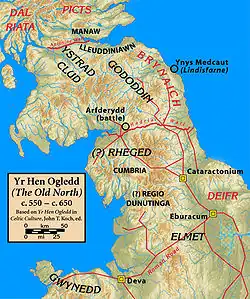 - Rheged – a major kingdom that evidently included parts of present-day Cumbria, though its full extent is unknown. It may have covered a vast area at one point, as it is very closely associated with its king Urien, whose name is tied to places all over northwestern Britain.[24]