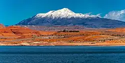The Henry Mountains is a mountain range located in the southeastern portion of the U.S. state of Utah that runs in a generally north-south direction, extending over a distance of about 30 miles (48 km). They were named by Almon Thompson in honor of Joseph Henry, the first secretary of the Smithsonian Institution. The nearest towns are Bicknell, Torrey, and Hanksville, which is north of the mountains. The Henry Mountains were the last mountain range to be added to the map of the 48 contiguous U.S. states (1872),[3] and before their official naming by Thompson were sometimes referred to as the "Unknown Mountains." In Navajo, the range is still referred to as Dził Bizhiʼ Ádiní ("mountain whose name is missing").[4]