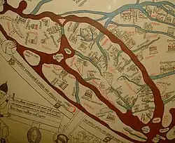The production of the map is likely to have involved the patronage of up to four men, Thomas de Cantilupe, Richard of Haldingham, Richard de Bello and Richard Swinefield, the Bishop of Worcester after Cantilupe. Richard of Haldingham, who died in 1278, may have been a senior relative of de Bello, and appears to be credited on the map as the designer (who "made and laid it out"). Richard de Bello's career from the later 1280 and 90s is linked to Swinefield's patronage in Lincoln, where Swinefield was briefly treasurer. Finally, of course, in creating the map for the Cantilupe cult, it was a sign of Swinefield's gratitude to his benefactor.[16] However, these possible links remain speculative, and it is equally possible that Richard of Haldingham and Swinefield knew each other directly, even assuming that the Haldingham that died in 1278 was the original drafter identified on the map.[17]