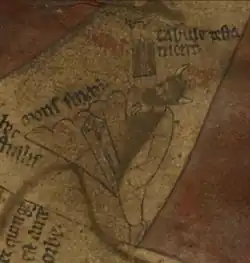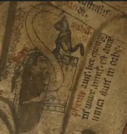 Some of the images are clearly derogatory and anti-semitic. For instance, within the Exodus cycle, a prominent scene depicts the worship of the Golden Calf. However, the Golden Calf is depicted as a devil defacating coins onto its altar.[24] The devil is labelled "Mahu(n)", a name for imaginary idols believed to be worshipped by Muslims, building an association with figures elsewhere on the map negatively representing Saracens.[25] The scene also depicts Christian crosses as present on the altar. This arguably moves the image into a depiction of host desecration, but at a minimum places the Jews in a position of mocking Christians. The four men labelled "Judaei" worshipping the devil hold a blank scroll, a symbol used to denote the association of Jews with scrolls containing the Word of God, yet in the view of Christians, having an inability to understand and accept it.[26] Overall, the Golden Calf scene, by labelling Israelites as "Jews", associating them with the mockery of Christians and with conceptions of Muslims or Saracens of the period through the "Mahun" figure, connects the Exodus story with contemporary Jews.[26]