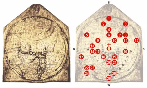 Utilizing the contemporary medieval styled T-O map of the time, the map is a biblically inspired map which shows Jerusalem drawn in the centre of the circle; east is on top, showing the Garden of Eden in a circle at the edge of the world (1).[39] Great Britain is drawn at the northwestern border (bottom left, 22 and 23). Curiously, the labels for Africa and Europe are reversed, with Europe scribed in red and gold as "Africa" and vice versa.[38] The Mediterranean Sea is shown at the bottom center, with the Straits of Gibraltar marking its most western point.[39]