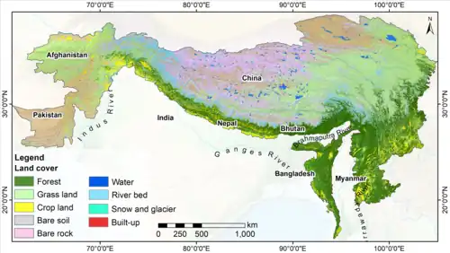 ICIMOD's first annual regional 30-meter resolution land cover database of HKH[62] generated using public domain Landsat images demonstrated that grassland was the most dominant land cover, followed by barren land, which includes areas with bare areas. In 2000, 2005, 2010, and 2015, grassland covered 37.2%, 37.6%, 38.7%, and 38.2%, respectively, of the total area of the HKH region. During the same years, the second dominant land cover was barren areas, including bare soil and bare rock. In 2000, 2005, 2010, and 2015, bare soil and bare rock covered 32.1, 31.4, 30.4, and 30.7%. The cropland cover in 2000 was about 5.1% and about 5.4% in 2015. Snow and glacier areas covered about 4% of the high-elevation section in 2018, while waterbodies and riverbeds/channels together accounted for 2%. The weather conditions also have an impact on the land cover patterns across the regions. In the HKH, forest cover is mostly distributed in the south and south-eastern areas, where precipitation is more; the grasslands are mostly distributed in the north and north-western parts, while cropland is mostly found in the southern part of the region.