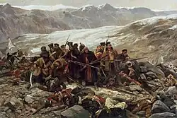 The Hindu Kush served as a geographical barrier to the British Empire, leading to a paucity of information and scarce direct interaction between the British colonial officials and Central Asian peoples. The British had to rely on tribal chiefs, Sadozai and Barakzai noblemen for information, and they generally downplayed the reports of slavery and other violence for geo-political strategic considerations.[108] The first British invasion of Afghanistan ended in disaster in 1842, when 16,000 British soldiers and camp followers were massacred as they retreated through the Hindu Kush back to India.[109]