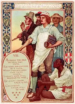 European immigrants joined the Union Army in large numbers, including 177,000 born in Germany and 144,000 born in Ireland, a full 16% of the Union Army.[48] Many Germans could see the parallels between slavery and serfdom in the old fatherland.[49]
