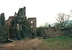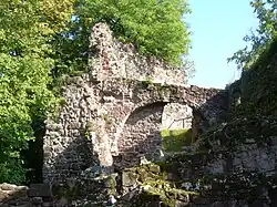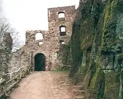 The Counts of Hohnstein, together with the Counts of Ilefeld who had married into them, inherited the lordship of the South Harz from Konrad. The newly founded dynasty of the Honstein-Ilfeld counts introduced the family Christian name, Elger, and chose Honstein Castle as their family seat; the modest Ilburg in nearby Ilfeld was probably abandoned at this point in time.[1] The first mention of Honstein Castle was in 1202. Like the Thuringian landgraves, the Honstein clan rapidly amassed a considerable amount of territory, which included the regions around Arnstadt and Gotha in the Thuringian Basin. The first boom period for the family during the 13th century was followed by a loss of importance when, in 1315, the estate was divided between several family lines. Honstein Castle soon became militarily outdated. In 1380 it was captured for the first time and then again in 1412 during a family dispute, which degenerated into the so-called Flegler War, during the course of which the Hohnstein counts lost their family castle.