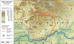 The region of Hotzenwald is not precisely defined in the records. In a narrower sense the Hotzenwald is the southernmost region of the Southern Black Forest, bounded in the west roughly by the Wehra, in the north approximately by the upper reaches of the Alb River near St. Blasien, in the east by the hill ridge between the Alb and Schlücht rivers, and in the south by the High Rhine and Klettgau rivers. This definition of the Hotzenwald more or less covers the same area as the territory of the former County of Hauenstein.