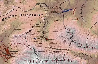 It formed during the Alpine orogeny of the Cenozoic Era. Initially, it was a large lake that filled in with Paleogene, Neogene and Quaternary materials.[1] It was originally part of the Mediterranean basin, connected to the sea by the corridor of the Almanzora River. Later, the action of the African and Eurasian tectonic plates raised it upward to become an endorheic lake (that is, one without an outlet) 1,000 metres (3,300 ft) above sea level.