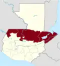 Huehuetenango covers an area of 7,403 square kilometres (2,858 sq mi) in western Guatemala and is bordered on the north and west by Mexico. On the east side it is bordered by the department of El Quiché and on the south by the departments of Totonicapán, Quetzaltenango and San Marcos.[6] The department encompasses almost the entire length of the Sierra de los Cuchumatanes mountain range, although there is a wide difference in altitude across the department, from heights of 3,352 metres (10,997 ft) above mean sea level to as low as 300 metres (980 ft) above sea level, encompassing an equally wide variation in local climate, ranging from mountain peaks where the temperature sometimes falls below freezing to tropical lowland rainforest.[7]
