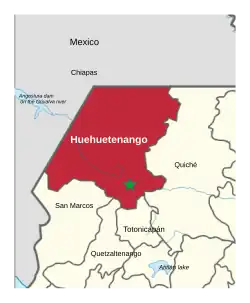 Huehuetenango (Spanish pronunciation: [w̝e.we.t̪eˈnãŋ.ɡo]) is one of the 22 departments of Guatemala. It is located in the western highlands and shares the borders with the Mexican state of Chiapas in the north and west; with El Quiché in the east, and Totonicapán, Quetzaltenango and San Marcos in the south. The capital is the city of Huehuetenango.[2]
