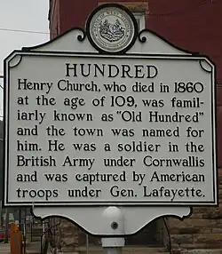 The community was named in honor of Henry "Old Hundred" Church (1751-1860) and his wife Hannah Church (1754-1860), who were both local centenarians.[6]