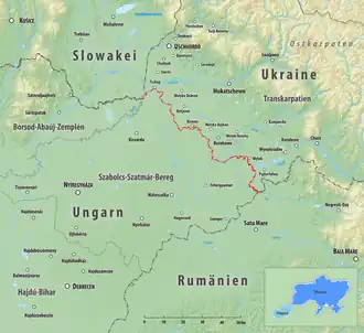 The Hungary–Ukraine border (Hungarian: magyar–ukrán államhatár; Ukrainian: Угорсько-український кордон) is an internationally established boundary between Hungary and Ukraine. The modern border remains unchanged since the end of the World War II. The current border was established after World War II when Zakarpattia Oblast was admitted into Ukraine, which at the time was part of the Soviet Union as the Ukrainian Soviet Socialist Republic. The border stretches for 136.7 km (84.9 mi) along the Tisza river valley.[1][2]