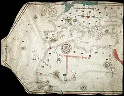 The term portolan is derivative from portolano which translates from Italian into 'pilot's book.' While the orientation of earlier maps was generally in the east, and then it moved southward with the Arabic influence established throughout various trade routes, Portolan charts were oriented to the north to make them easier to read.[11] Portolan charts began to surface just prior to the beginning of the 14th century, but the division of such a practical creation was very significant in the map-making world. They were specifically used to solve specific problems. Each chart was an individual, which is important in comparison to the typical map, which had to be studied often with some sort of text to accompany it. The development of Portolan charts is thought to have begun due to an increasing overseas trade empire.[9] Portolan charts were produced with a combination of chart and compass, allowing sailors to venture out farther onto the open water without as significant of a fear of the hopelessness of getting lost. The manufacturer of the chart would draw a scaled distance along with compass bearings to create angles in order to connect the different areas. Using the chart, the sailor or navigator would set a course from one point to the next, and then use what are known as rhumb lines, which are lines of longitude that all cross the meridian at exactly the same angle, to translate the desired course onto a compass heading.[12]
