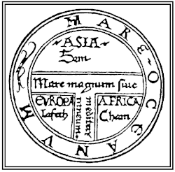 To better understand the map-making process, a step back in time is required, as Claudius Ptolemaeus, better known as Ptolemy, whose eight-volume work entitled Geography played a large role in the development of cartography once it was translated into Latin in 1406. Ptolemy projected two different types of maps in his text. The first, known as a conic projection, dealt with the latitude parallels consisting of round arcs. The second, known as a pseudoconic projection, consisted of longitude lines being round.[6] Ptolemy's work were heavily influential in Islamic science as well, whose maps were quite similar to the Portolan charts and were partly influential on the Catalan map by Abraham Cresques.[7] In the early 14th century, many of the maps were known as T and O maps, termed because of a circle representing the earth, and within the circle a T-shape to designate the division of different known land masses, which were Europe, Africa, and Asia. This particular style was representative in the well-known Spanish Mappa Mundi which was developed a few centuries beforehand, but was also the first map to actually be printed in 1472. Some of these earlier maps relied heavily on Arabic influence, which is evident in the inclusion of frequent Arabic place names. It is thought that this information could have been gathered through experiences throughout different trade routes. The T-O style of map shows a lack of information regarding the specific details of land masses, but once trade began to flourish, so did the detail in maps.[8] Following the simplicity of the T-O style, maps began to grow into a greater, fantasy-inspired style. Where beforehand, the descriptiveness was minimal, maps now included beautiful drawings of angels and mythical creatures, and oftentimes these maps were used to understand what was considered to be the history. In the 15th century, maps began to develop an idea and representation of distinctive frontiers. Where the previous maps had indulged in fantastical depictions, terminology began to show up much more frequently now, such as names for regions and provinces.[9] The influence of an eastern orientation was one of the first things to change from the typical features of maps with the loss of fantastical creatures being depicted and the inclusion of more detailed landmasses, and it is possible that this was happening because Arabic influence was causing maps orientation to move away from the east and more toward the south.[10]