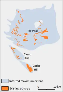 The Ice Peak Formation consists of lava and pyroclastic rocks that were erupted mainly from vents near the summit of the Ice Peak stratovolcano.[39] Two stratigraphic units comprise this once symmetrical stratovolcano, both of which are lithologically distinct.[19] The lower stratigraphic unit, which forms much of the volcanic pile, is an assemblage of mostly thin basaltic lava flows. Lavas of intermediate composition such as tristanite, trachybasalt and mugearite are very limited in extent.[40] The upper stratigraphic unit is a highly varied succession of lavas and pyroclastic rocks forming the high, central edifice of Ice Peak.[39] It consists of basalt, trachyte and a variety of intermediate rocks such as tristanite, trachybasalt, benmoreite and mugearite.[41]