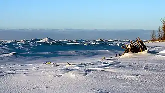 An ice dune, also called an ice ridge or an ice foot, is a formation of ice that accumulates on the shores of many arctic beaches and is also common along the shores of the Great Lakes during the winter.[1] Ice dunes are not to be confused with ice shoves, which accumulate on bodies of water then push their way on shore, carrying sediment with them and deforming the shoreline.