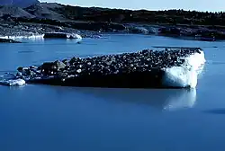 Ice rafting is the transport of various materials by floating ice.[1] Various objects deposited on ice may eventually become embedded in the ice. When the ice melts after a certain amount of drifting, these objects are deposited onto the bottom of the water body, e.g., onto a river bed or an ocean floor.[2][3] These deposits are called ice rafted debris (IRD) or ice rafted deposits. Ice rafting was a primary mechanism of sediment transport during glacial episodes of the Pleistocene when sea levels were very low and much of the land was covered by large masses (sheets) of ice. The rafting of various size sediments into deeper ocean waters by icebergs became a rather important process. Ice rafting is still a process occurring today, although its impact is significantly less and much harder to gauge.