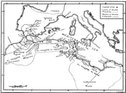 To the south, Ifriqiya was bounded by the semi-arid lands and salt marshes named el-Djerid. The northern boundary fluctuated from as far north as Sicily to the North African coastline, and the western boundary usually reached Béjaïa. Ifriqiya is bordered to the west by the Central Maghreb, with which the borders are fluid depending on the chroniclers and the eras. The capital was briefly Carthage, then Qayrawan (Kairouan), then Mahdia, then Tunis.[6] The Aghlabids, from their base in Kairouan, initiated the invasion of Southern Italy beginning in 827, and established the Emirate of Sicily, which lasted until it was conquered by the Normans, and the short-lived Emirate of Bari.