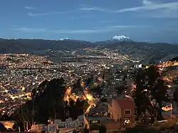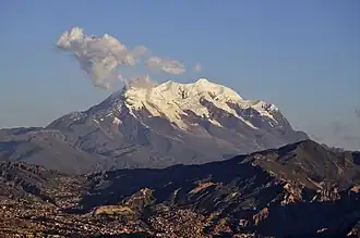 Illimani (Aymara and Spanish pronunciation: [iʎiˈmani]) is the highest mountain in the Cordillera Real (part of the Cordillera Oriental, a subrange of the Andes) of western Bolivia. It lies near the cities of El Alto and La Paz at the eastern edge of the Altiplano. It is the second highest peak in Bolivia, after Nevado Sajama, and the eighteenth highest peak in South America.[3] The snow line lies at about 4,570 metres (15,000 ft) above sea level, and glaciers are found on the northern face at 4,982 m (16,350 ft). The mountain has four main peaks; the highest is the south summit, Nevado Illimani, which is a popular ascent for mountain climbers.