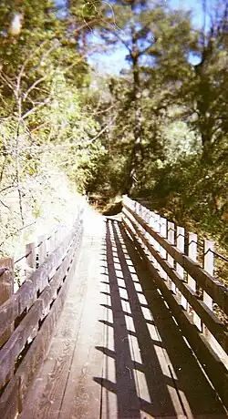 Founded by Olmsted and Sally Cates, and built with help from countless locals, the Independence Trail transformed the historic Excelsior gold mining ditch into the nation's first identified handicapped-accessible wilderness trail. It was one of the most popular trails in the area, contouring along wooded hillsides, passing live streams, and crossing deep gorges on restored wooden flumes that once transported water for hydraulic mining. Due to safety hazards caused by landslides from heavy storms in 2017 [5] and the Jones Fire of 2020 destroying the wooden walkways, the trail is closed until further notice. It is in the process of being rebuilt.[6][1]