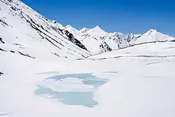 The basin contains the largest amount of perennial glacial ice outside of the polar regions.[1] A majority of the runoff in the Indus drainage basin comes from meltwater—glacial melt contributing 41% and snowmelt providing 22%—of the Himalaya, Hindu Kush and Karakorum mountains.[5] Rainfall contributes the remaining. On average, a little over half of the entire annual flow is received within the three months from July to September, when monsoonal rains combine with meltwater.[6] As a result, the region has historically seen substantial flooding in the summer months.[7]